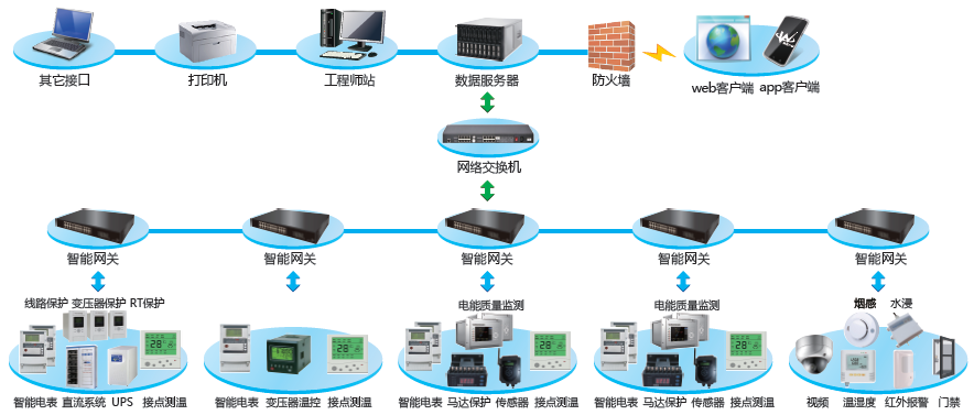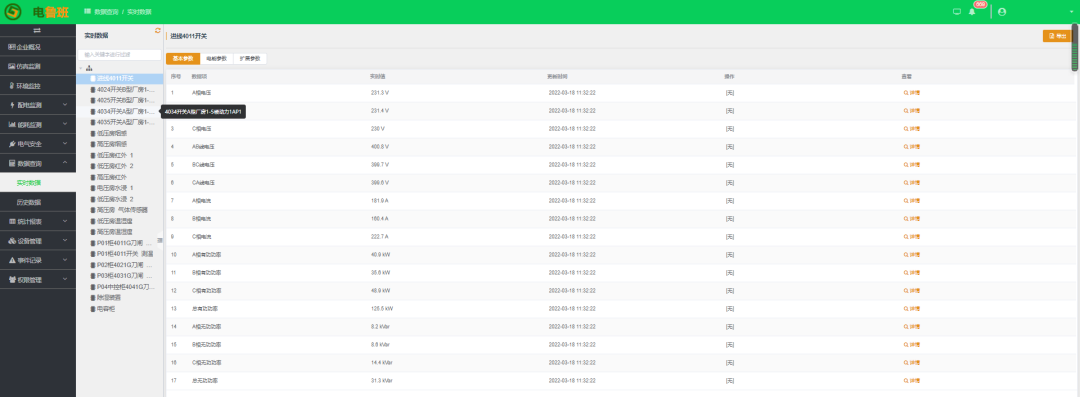 對配電系統內智能電力設備進行實時監控,實時顯示電流、電壓、開關狀態等電力參數和功率、無功、有功電度和無功電度等電能參數,通過3D仿真實景圖、一次接線圖、工況圖等對現場數據進行展示,方便電能管理人員及時掌控電網的運行狀況。