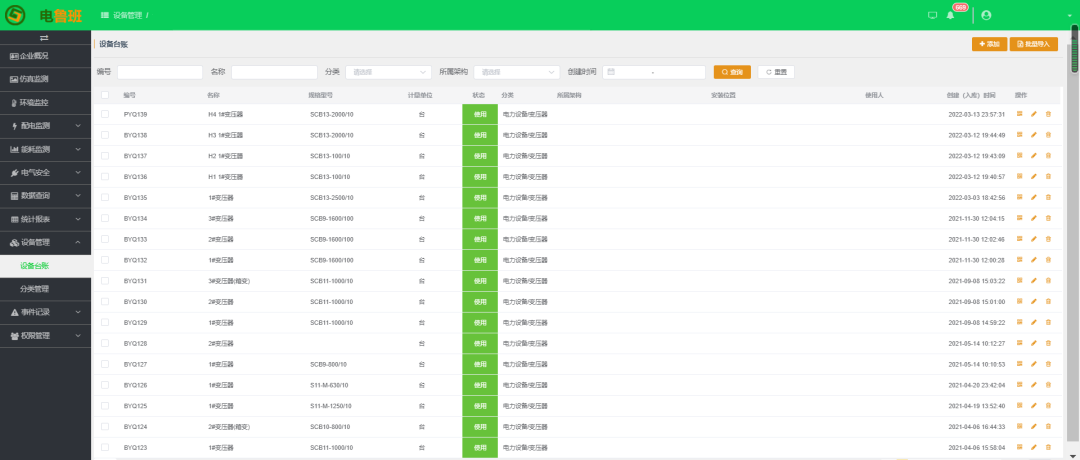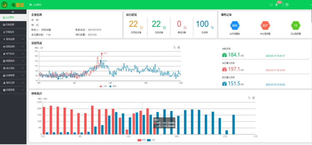 展示企業配電設備的概況,包括變壓器容量、報警信息匯總、采集設備的數量以及在線率,配變的當前負荷、當日最大負荷和昨天最大負荷情況匯總,有功電量同比統計以及負荷曲線。