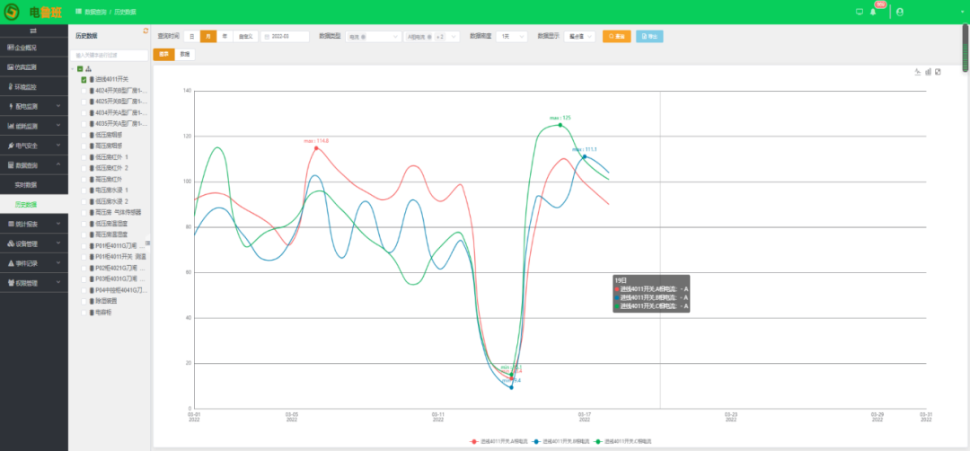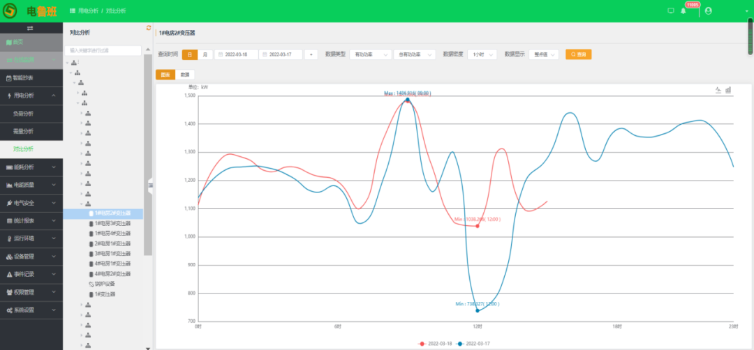 對設備運行數據按日、周、月、季、年的時間進行趨勢分析,及時了解設備的運行狀況;支持同一設備不同時間段的數據對比分析和同一時間段不同設備的數據對比分析。