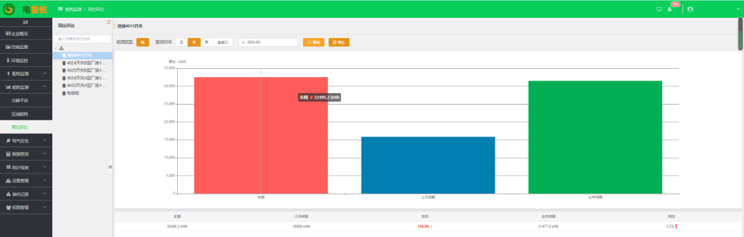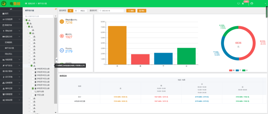 對配電系統的整體電能進行管理,分時分段尖峰平谷電量、電費統計分析,日周月季年電能消耗的分析,指導企業錯峰填谷,實現配網經濟、可靠、穩定運行的目標。