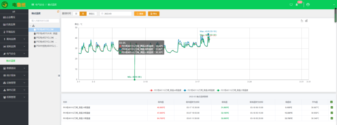 系統針對配電設備(斷路器、變壓器、電纜等) 觸點及設備溫度進行監測, 提前發現因機械因素(斷路器 觸點、低壓母線搭接處接觸不良等)引起的發熱、熔斷等缺陷,在線監測省去了人工巡檢的工作量,并避免了人工巡檢在時間空間上的限制,可不間斷的實時在線測溫。